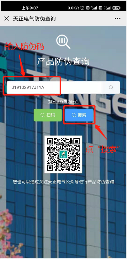2、在输入框内输入防伪码,点击“搜索”按钮,即可弹出查询结果
